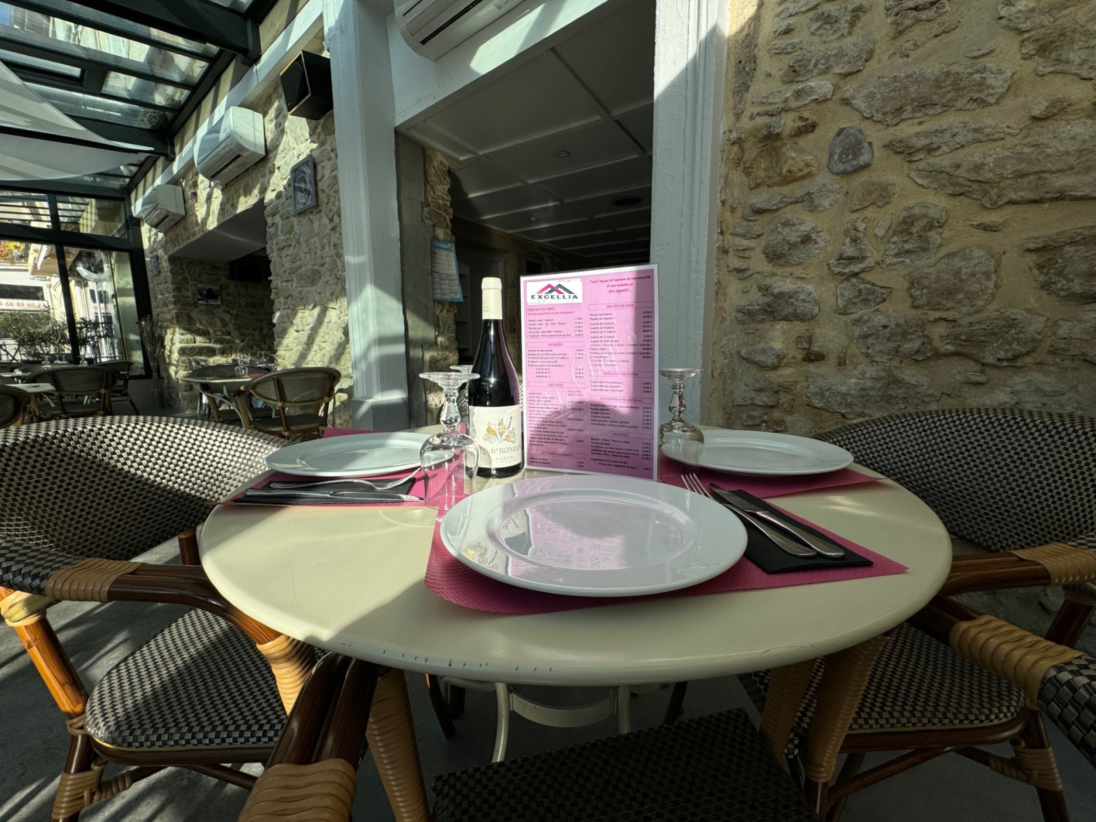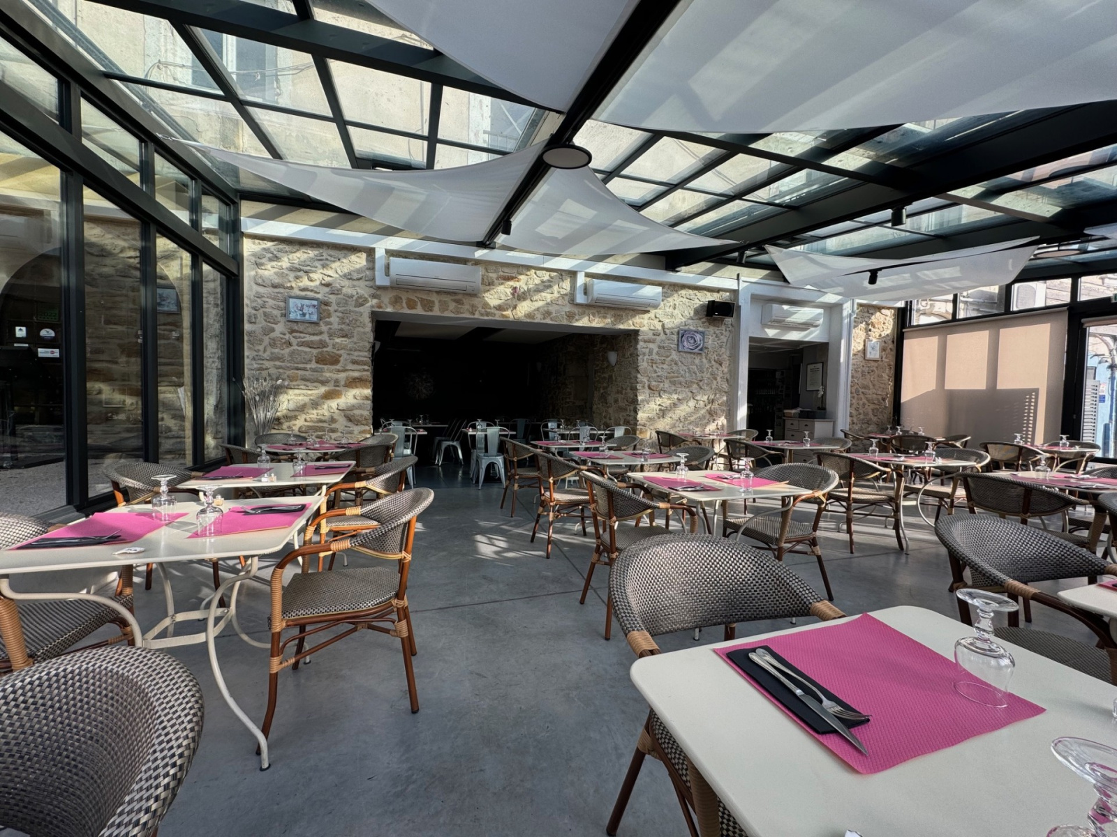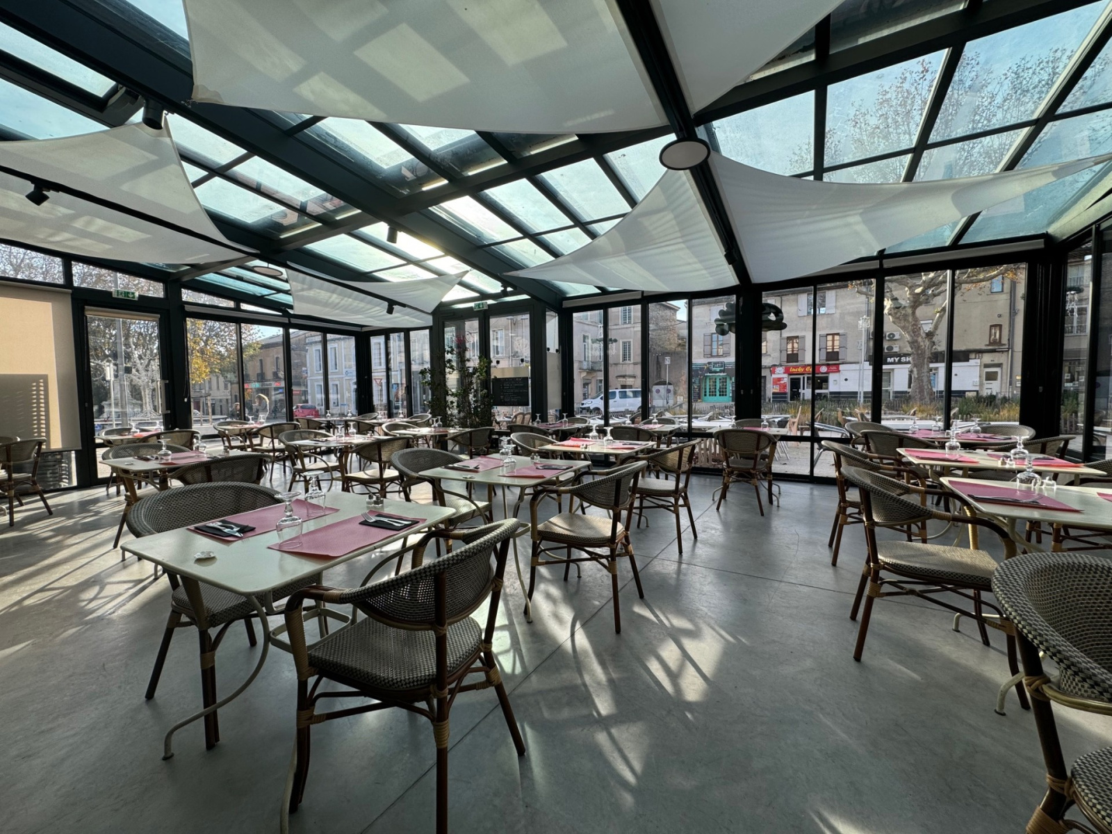 Pour les jours de pluie, une agréable véranda bio climatique vous accueillera afin de déguster de bons plats faits maison avec une jolie vue sur la place.